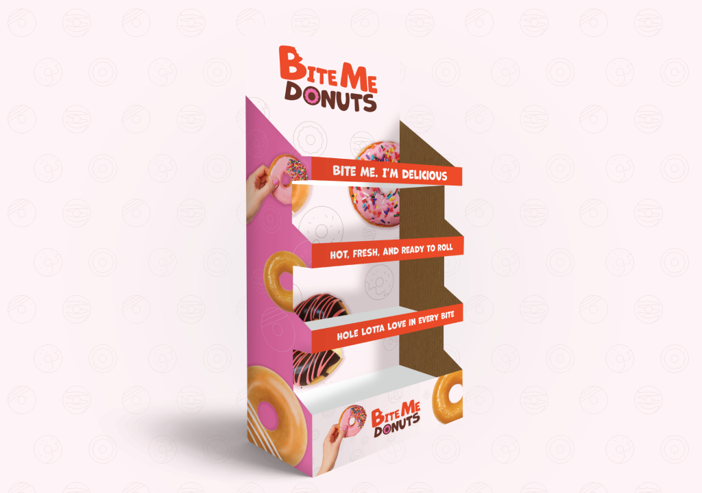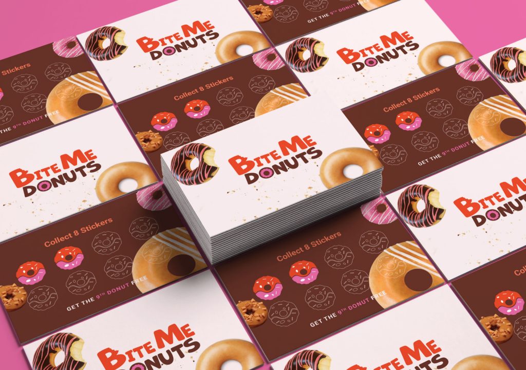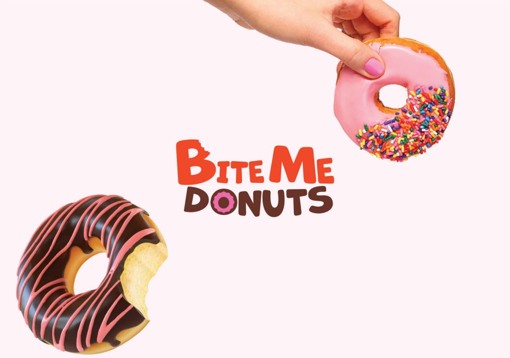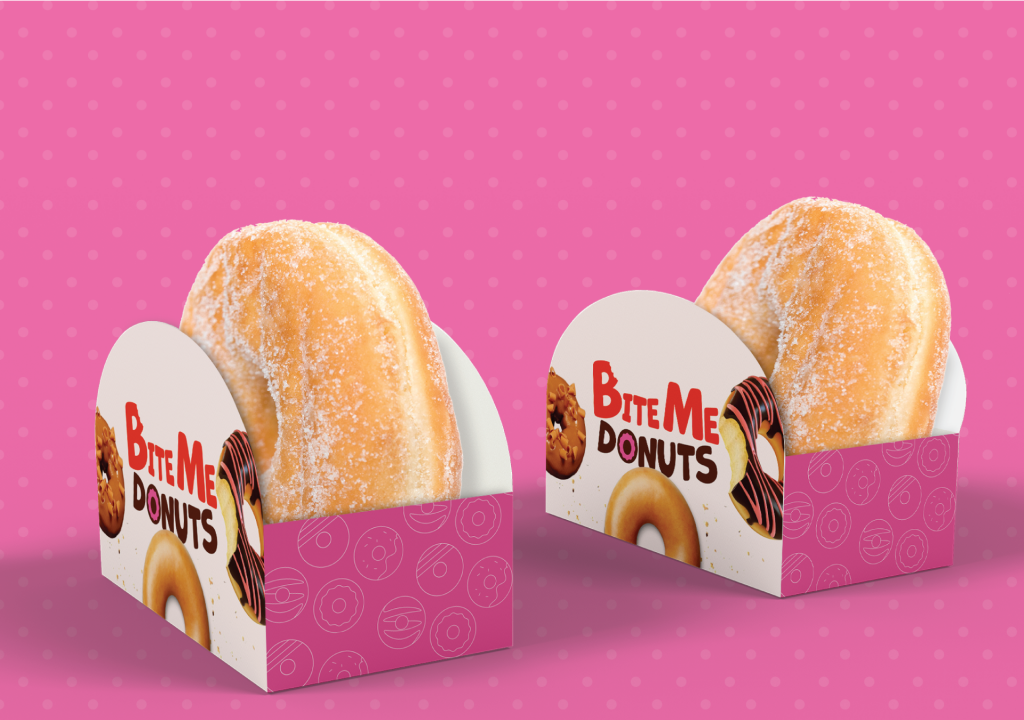 The final identity is bright, bold and full of character. Donut icons and playful visuals bring the brand to life across packaging, social media and in-store displays, making Bite Me Donuts instantly recognisable and approachable.