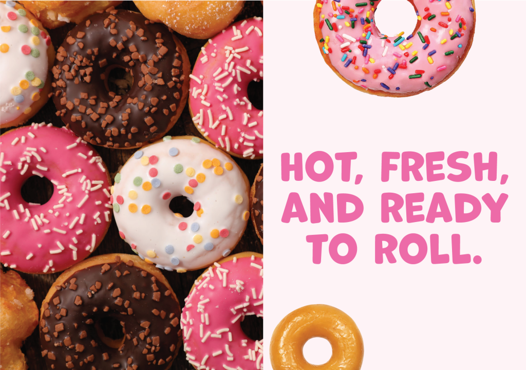 The design process focused on bold colours, playful typography, and the use of donut icons to convey flavour and personality. Donut imagery and graphic elements were used throughout to create a cohesive visual language. Concepts were refined based on feedback to ensure the brand felt welcoming and fun.