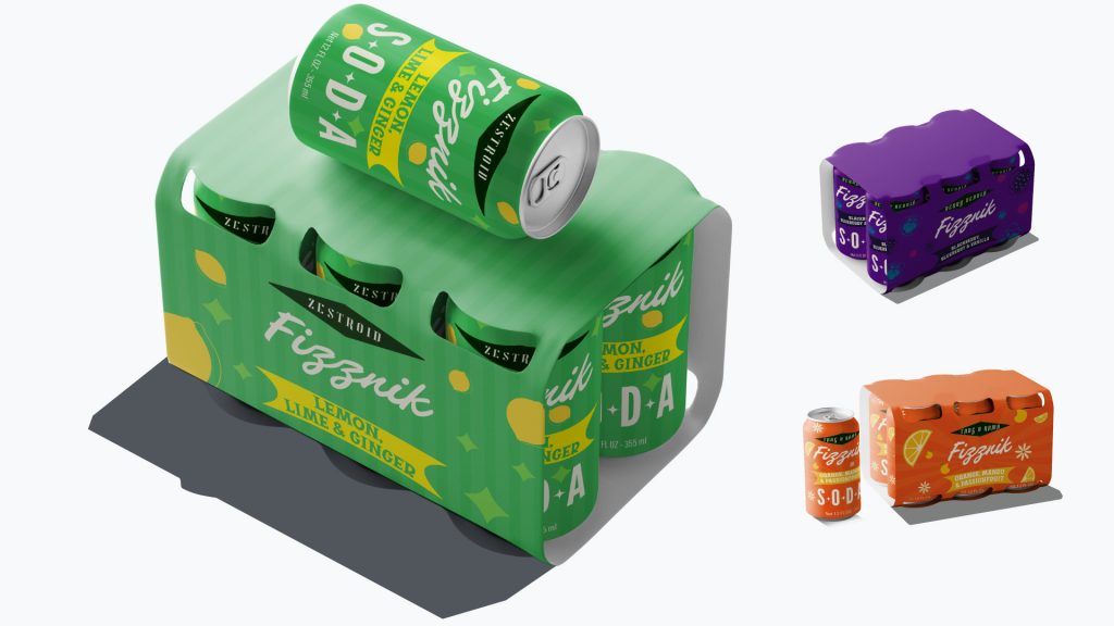 Fizznik’s final brand system includes a playful logo, colour-coded packaging for three core flavours, and supporting assets such as merch and advertising.